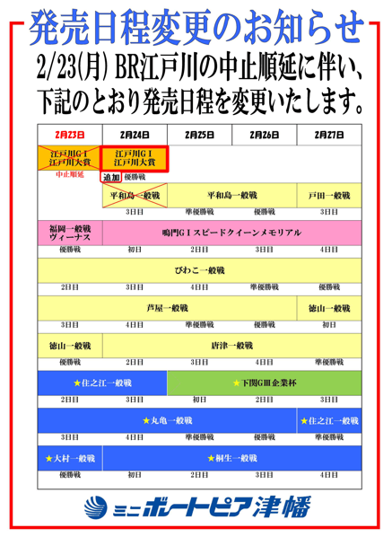 2/23(月) BR江戸川の開催が中止順延となりましたので、発売日程を変更いたします。